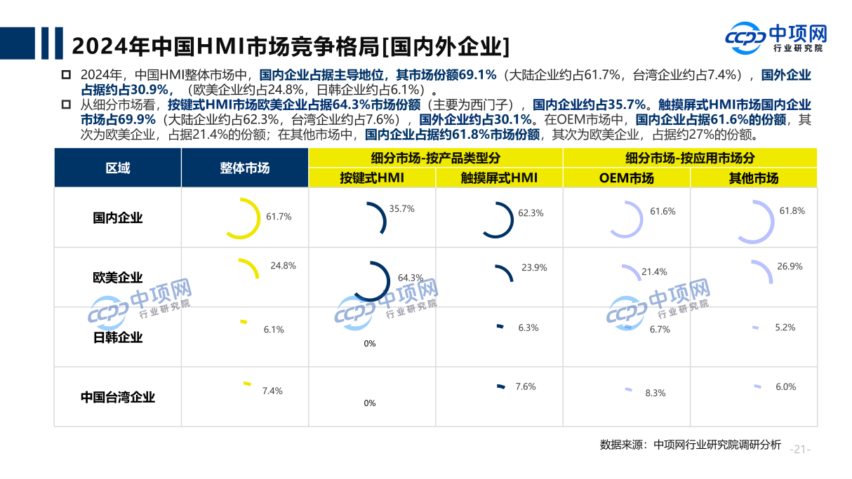 2024年,中国HMI整体市场中,国内企业占据主导地位◆◆,其市场份额69.1%(大陆企业约占61■◆◆★★■.7%★★,台湾企业约占7.4%),国外企业占据约占30.9%◆◆★■★◆,(欧美企业约占24.8%,日韩企业约占6★◆★★■.1%)。