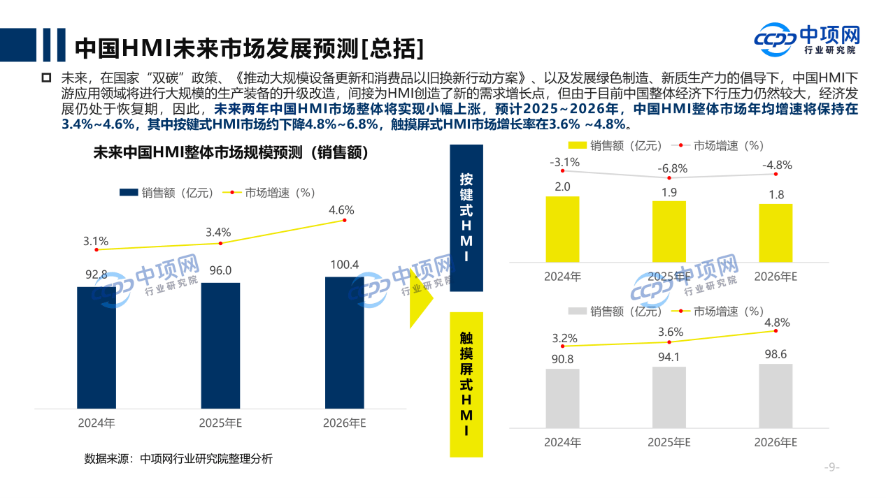 未来,在国家“双碳★★★◆◆”政策、《推动大规模设备更新和消费品以旧换新行动方案》★■★★、以及发展绿色制造、新质生产力的倡导下■★■◆★★,中国HMI下游应用领域将进行大规模的生产装备的升级改造,间接为HMI创造了新的需求增长点,但由于目前中国整体经济下行压力仍然较大,经济发展仍处于恢复期,因此,未来两年中国HMI市场整体将实现小幅上涨,预计2025~2026年,中国HMI整体市场年均增速将保持在3.4%~4.6%,其中按键式HMI市场约下降4.8%~6.8%★■,触摸屏式HMI市场增长率在3.6%~4.8%。