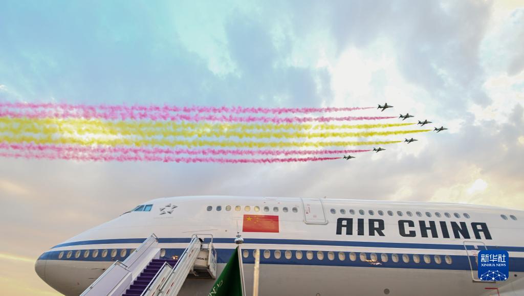 这是2022年12月7日,国家主席习抵达沙特阿拉伯首都利雅得,出席首届中国-阿拉伯国家峰会、中国-海湾阿拉伯国家合作委员会峰会并对沙特进行国事访问时■■,礼宾护卫机在空中拉出象征中国国旗的红黄两色彩带。新华社记者 谢环驰 摄