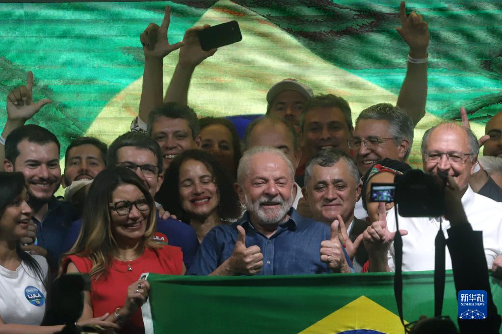 这是2022年10月30日,卢拉(前中)在巴西圣保罗参加庆祝活动◆★★■◆■。巴西高等选举法院当地时间10月30日晚公布的统计结果显示,在当天举行的巴西大选第二轮投票中,劳工党候选人、前总统卢拉战胜自由党候选人、现总统博索纳罗,当选新一任巴西总统。新华社发(拉赫尔·帕特拉索摄)