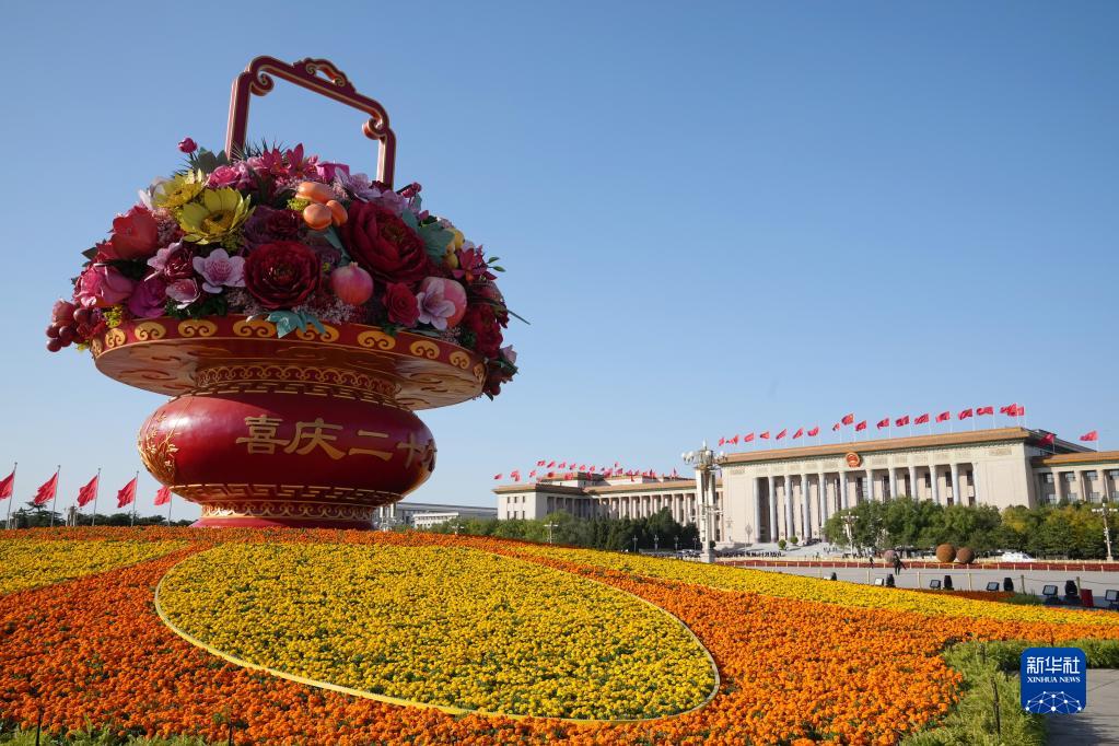 这是2022年10月16日在广场拍摄的“祝福祖国”巨型花果篮。中国第二十次全国代表大会于10月16日至22日在北京举行。新华社记者 王毓国 摄