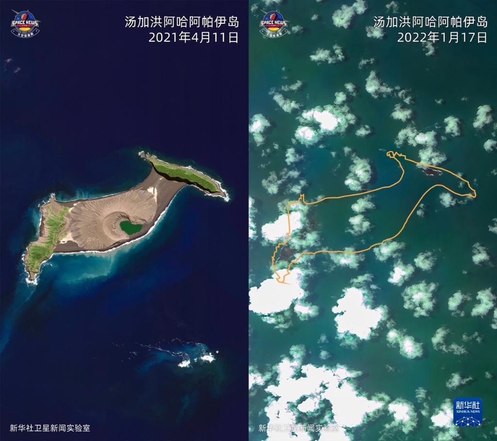 2021年4月11日Worldview02卫星拍摄的汤加洪阿哈阿帕伊岛卫星图片(左)和2022年1月17日■■“高分一号”卫星拍摄的该岛火山喷发后的卫星图片◆★■■,橘色曲线为按照地理坐标标注出的岛屿原先轮廓(拼版照片)。新华社发(新华社卫星新闻实验室供图)