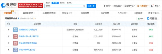 天眼查App显示,小英(本名★◆■★◆:杨早英)名下共关联4家企业,其中寻甸县小英一家土特产店◆★◆、昆明甄宏文化有限公司为存续状态◆■■,其余2家已注销★★◆■★。