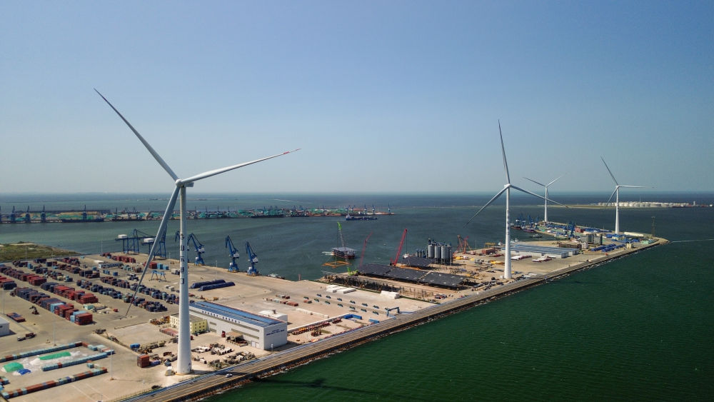 在山东潍坊港,风力发电机为港区提供电力(2025年6月12日摄,无人机照片)◆★◆。新华社记者 徐速绘 摄